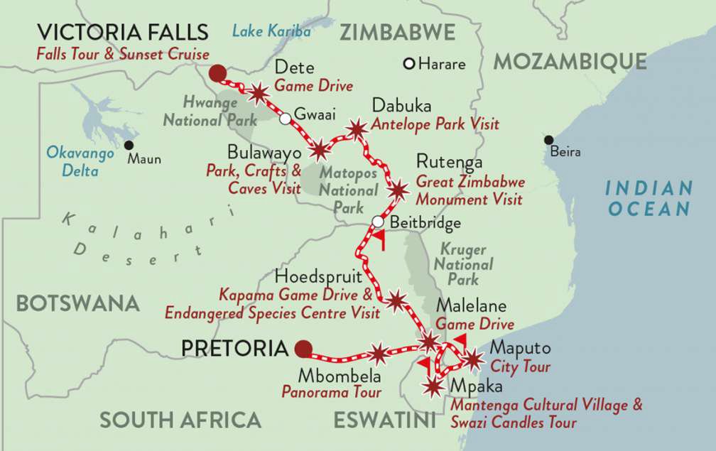 Visitando: África do Sul, Moçambique, Zimbabwe, Zâmbia e Botswana.